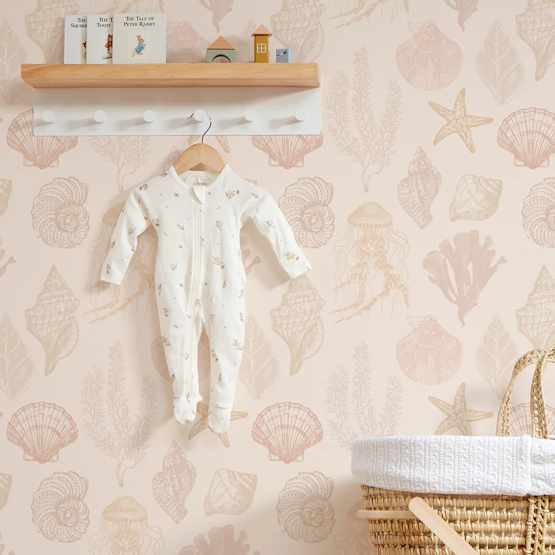 A world under the sea teems with colourful life on this relaxing seashell wallpaper. Perfect for children's wallpaper, the pretty design features jellyfish, clams and starfish all twirling rhythmically in the sea currents. The abundantly colourful design features pink and orange sea creatures submerged on a pale orange backdrop. This pink seashell wallpaper creates a soft and stylish look, ideal for kids who want a more mellowed and mature design. Kids and adults alike are mesmerised by sea life, so why not hang it in your bedroom as well as theirs?