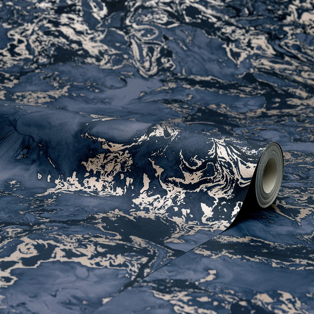 Add a truly beautiful addition to your living room or bedroom with our Liquid Marble Wallpaper in Blue and Bronze here at I Love Wallpaper. This inky blue wallpaper with a mesmerising marble effect is a perfect option for creating a unique and inviting space full of character and depth. Inspired by eye-catching marble patterns, the design is made up of beautiful contrasting swirls in blue and bronze, coming together to form scintillating shapes and patterns. The whole paper is finished off with a metallic sheen to heighten the stunning visual effect. Our Liquid Marble Wallpaper in Blue and Bronze is suitable for papering full rooms and is an ideal option for creating a statement feature wall.