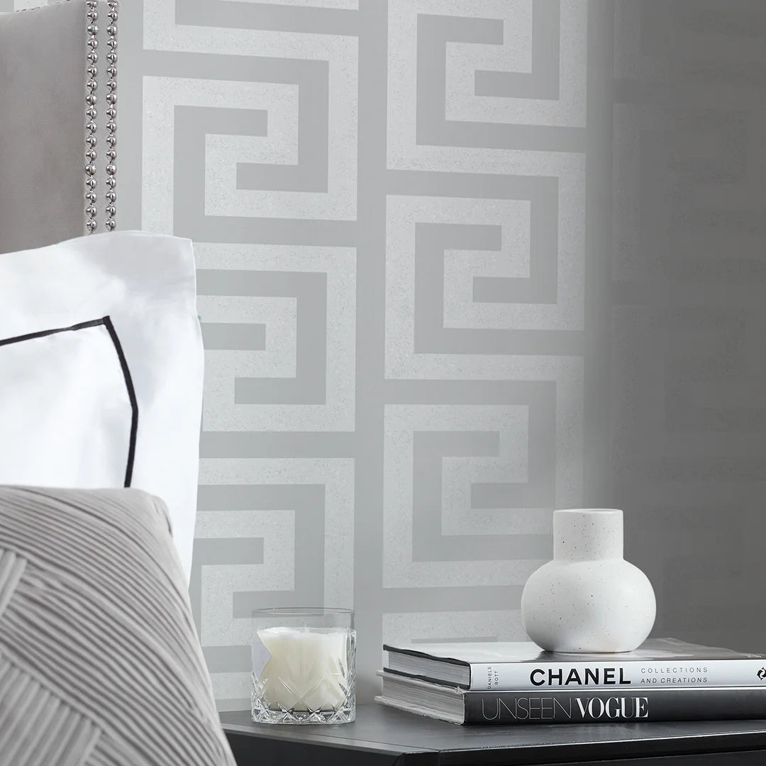 Part of our brand new London wallpaper collection, this gorgeous silver design features the classic Greek Key pattern set upon a beautiful metallic background that boasts an amazing sheen when the light catches it. This beautiful and contemporary paper will help create a welcoming atmosphere in any living area and elevate any interior scheme. The stunning silver print of this Greek Key pattern wallpaper makes it an ideal choice for papering a whole room or for creating a statement feature wall in a living room, dining room or bedroom.