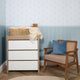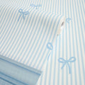 Our Delicate Bows on Pinstripe Panel wallpaper creates a sweet, classic, and slightly whimsical aesthetic. Bathed in a calming blue hue, the design features delicate bow motifs scattered across vertical pinstripes, enhanced by a timeless blue beadboard panel effect. This allows you to achieve the coveted wood panel look affordably. Perfect for creating a sweet, calming atmosphere in nurseries, adding playful energy to playrooms, or lending feminine elegance to dressing rooms, be they for teens or adults. The wallpaper's gentle tonal pink complements our white whisper or ivory spray matt emulsion paint beautifully.