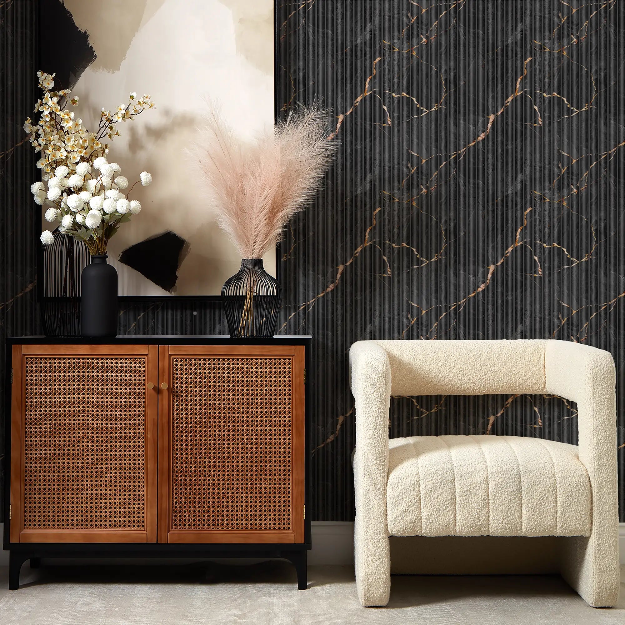 Transform your walls into a statement of modern luxury with our exquisite Fluted Marble Panel wallpaper. This innovative design captures the intricate beauty of natural marble, showcasing striking charcoal hues. A delicate whisper of gold marble effect threads throughout, offering a sophisticated gleam. Experience the contemporary appeal of a fluted texture effect combined with the enduring elegance of marble, designed to bring an opulent yet natural feel to your interior. Crafted from high-quality materials with a simple paste-the-wall application, this design is perfectly complemented by our champagne creme matt emulsion paint.