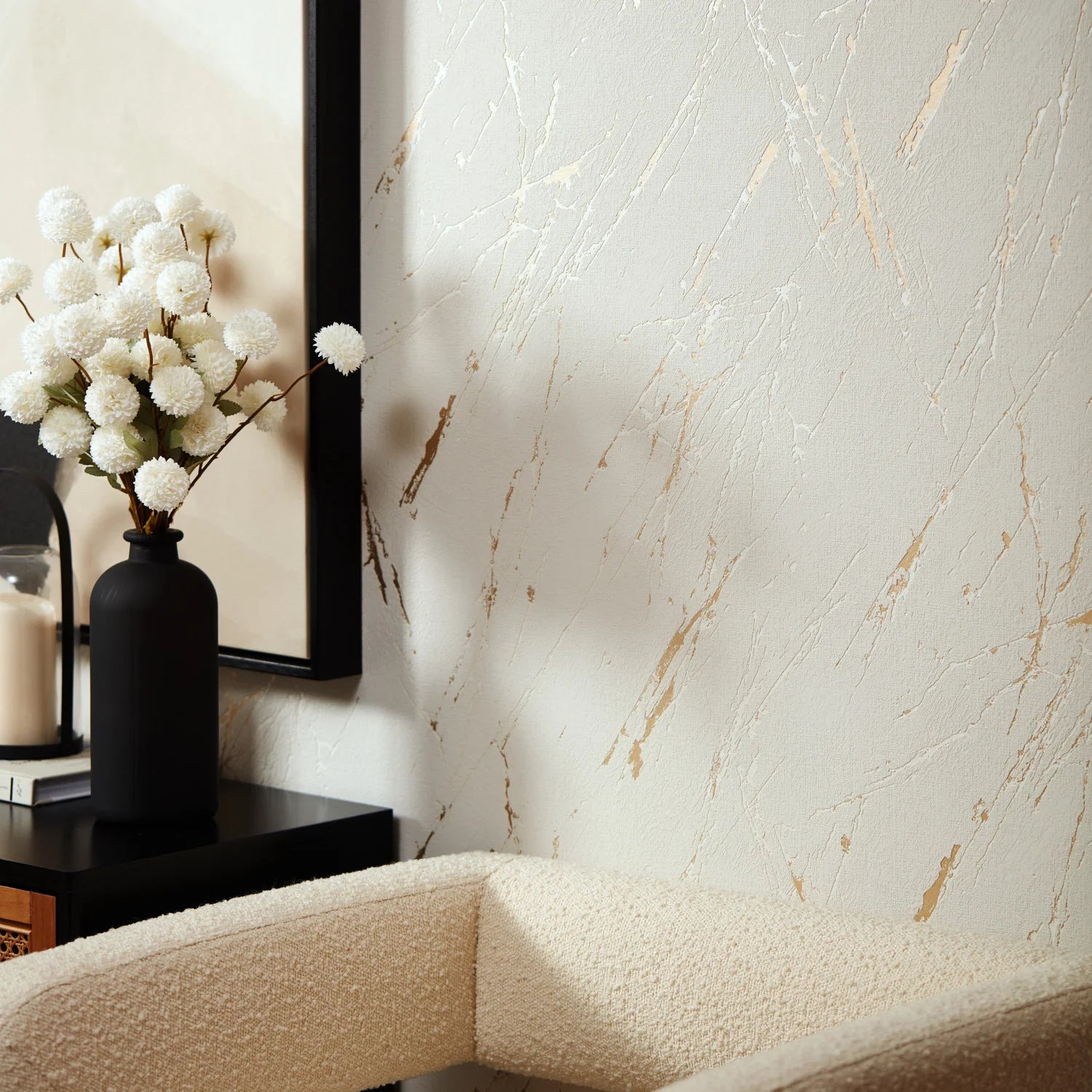 Breathe luxury into your walls with Sienna wallpaper in ivory and gold. This textured wallpaper features metallic gold traces rippling throughout that reflect a radiant glow when caught by the light, creating a stylish sheen all year round. The white and gold colour combination is wonderfully versatile and suits a variety of colours and interior decor styles, allowing you to pop in your favourite accessories and complementing shades! For a classic chic look, add some sleek black accents that make a striking contrast against the white backdrop, indulging the flecks of gold further. Hang this metallic print in a living room or bathroom to create a bright, light and inviting aura that radiates warmth and luxury.
