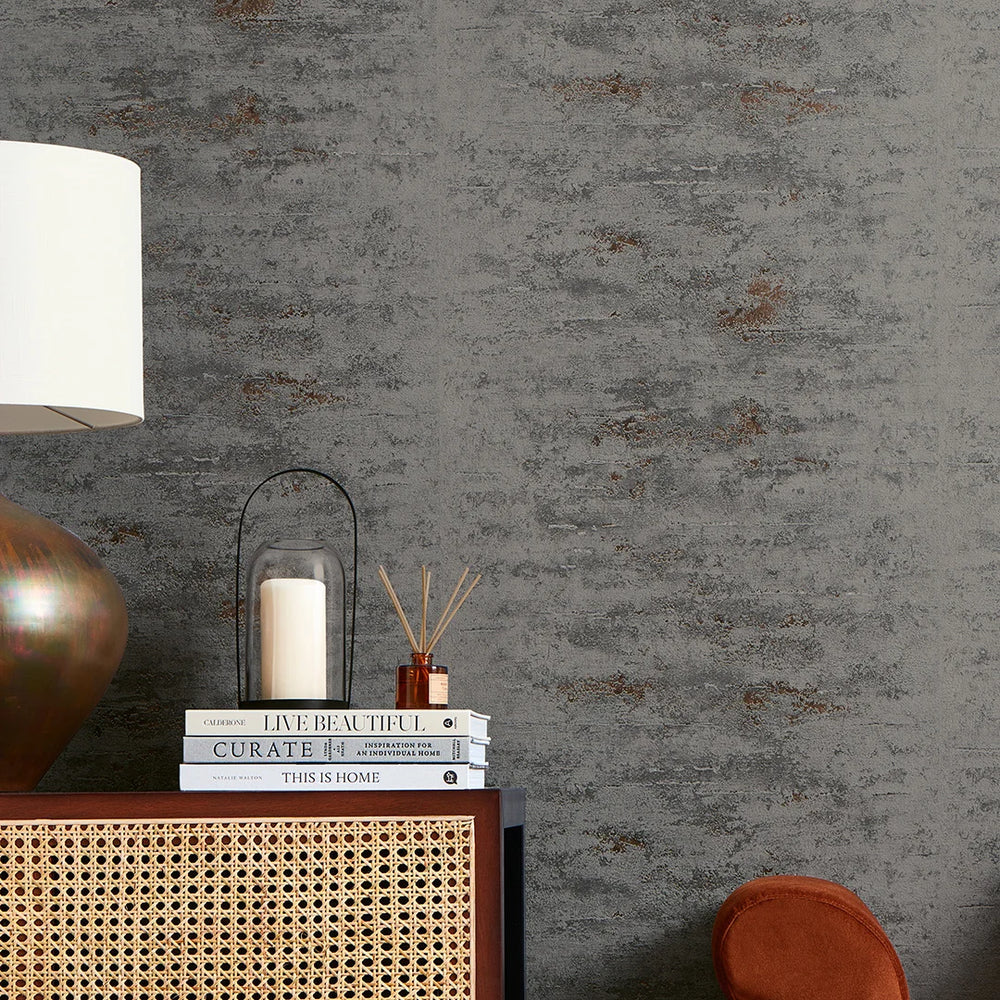 Elevate your living area with our Venice Industrial Metallic wallpaper in charcoal and copper. Perfect for industrial or rustic interiors, this contemporary design offers a twist on classic metallic papers by combining contrasting colours of charcoal and copper together and is enhanced further by a beautiful metallic sheen that catches the light. Our Venice Industrial Metallic wallpaper in charcoal and copper can be used to paper a whole room or works beautifully as a feature wall.